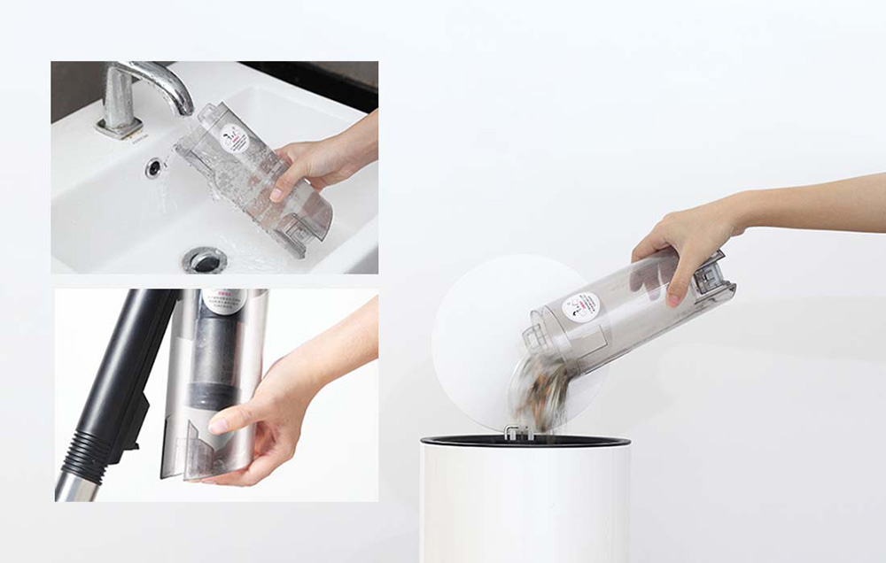 The Deerma DX600 vacuum cleaner is equipped with a large 0.8 litre dust container. To empty it, simply detach it from the device by pressing the button. Then simply throw the waste into the garbage can – you won’t even get your hands dirty! You can also wash the tank under running water without any worries and reuse it after drying – this way you will prolong its life and avoid the multiplication of bacteria.