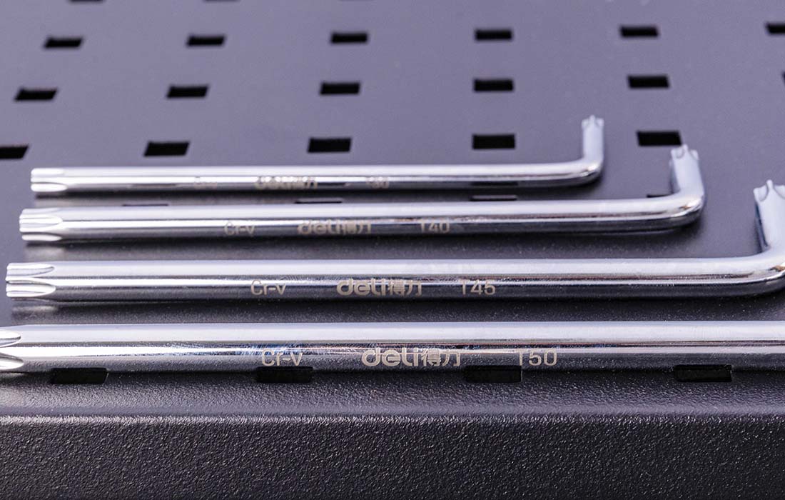 Le jeu Deli EDL3091 comprend 9 clés Torx hexagonales : T10, T15, T20, T25, T27, T30, T40, T45 et T50. Fabriquées en acier CrV chromé, elles sont extrêmement durables. Ces outils pratiques seront utiles dans presque tous les ateliers. Le rangement et le transport des clés sont facilités grâce à une petite boîte incluse dans le set.