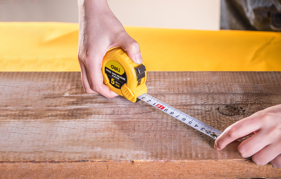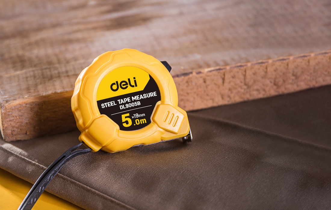 Mètre à ruban Deli de 5m, outil universel pour des mesures précises à la maison ou au travail. Pratique avec bouton et verrouillage automatique.
