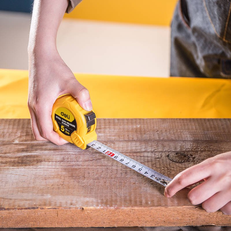 Mètre à ruban Deli de 5m, outil universel pour des mesures précises à la maison ou au travail. Pratique avec bouton et verrouillage automatique.
