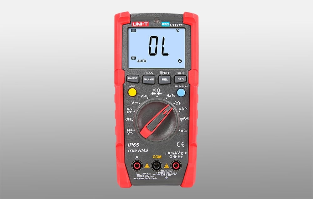Le UNI-T UT191T est un multimètre numérique professionnel conçu pour une utilisation dans des environnements industriels difficiles. Équipé de la fonction True RMS, cet appareil fournit des mesures précises de la tension, du courant, de la résistance, de la capacité, de la fréquence et de la température. Le UT191T offre une résolution de 6 000 comptes et permet une sélection de plage automatique ou manuelle. Son boîtier répond à la norme IP65 et résiste à des chutes d’une hauteur allant jusqu’à 2 mètres, ce qui en fait un outil idéal pour des conditions changeantes et exigeantes.