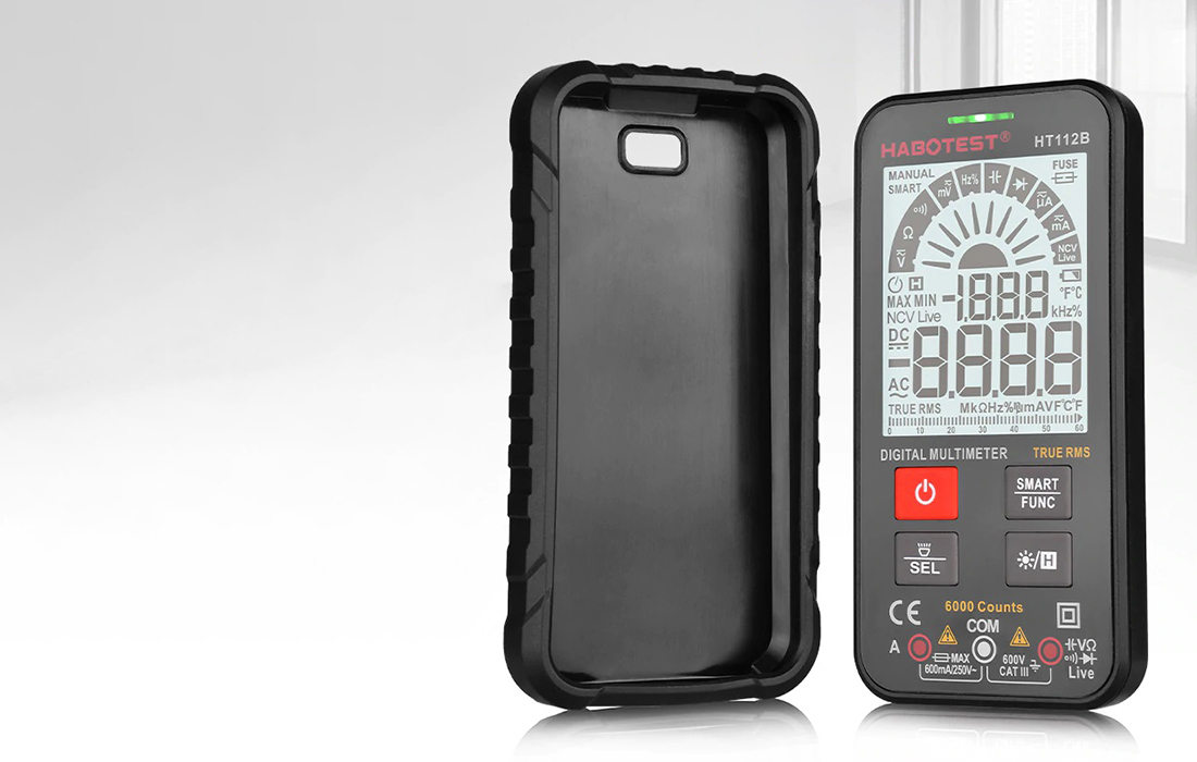 Le HT112B est un multimètre intelligent ultra-fin avec un écran de 7,3 cm et des boutons en silicone. Précis et léger, il dispose d’une lampe de poche LED.