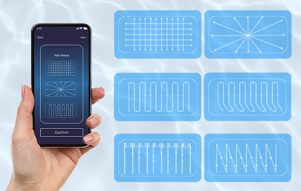 Le Wybot M1C se déplace le long de parcours optimisés garantissant une couverture maximale de la surface de la piscine. Grâce à des algorithmes de navigation avancés, le robot peut fonctionner selon plusieurs motifs : le chemin en étoile, qui assure un nettoyage approfondi, ou le chemin en S, idéal pour une couverture uniforme de la surface. Pour un nettoyage plus intensif, le robot utilise le parcours en croix, tandis que le parcours régulier est adapté au nettoyage quotidien. Des motifs avancés en H et en N sont également disponibles, garantissant un nettoyage précis même des zones difficiles d’accès.