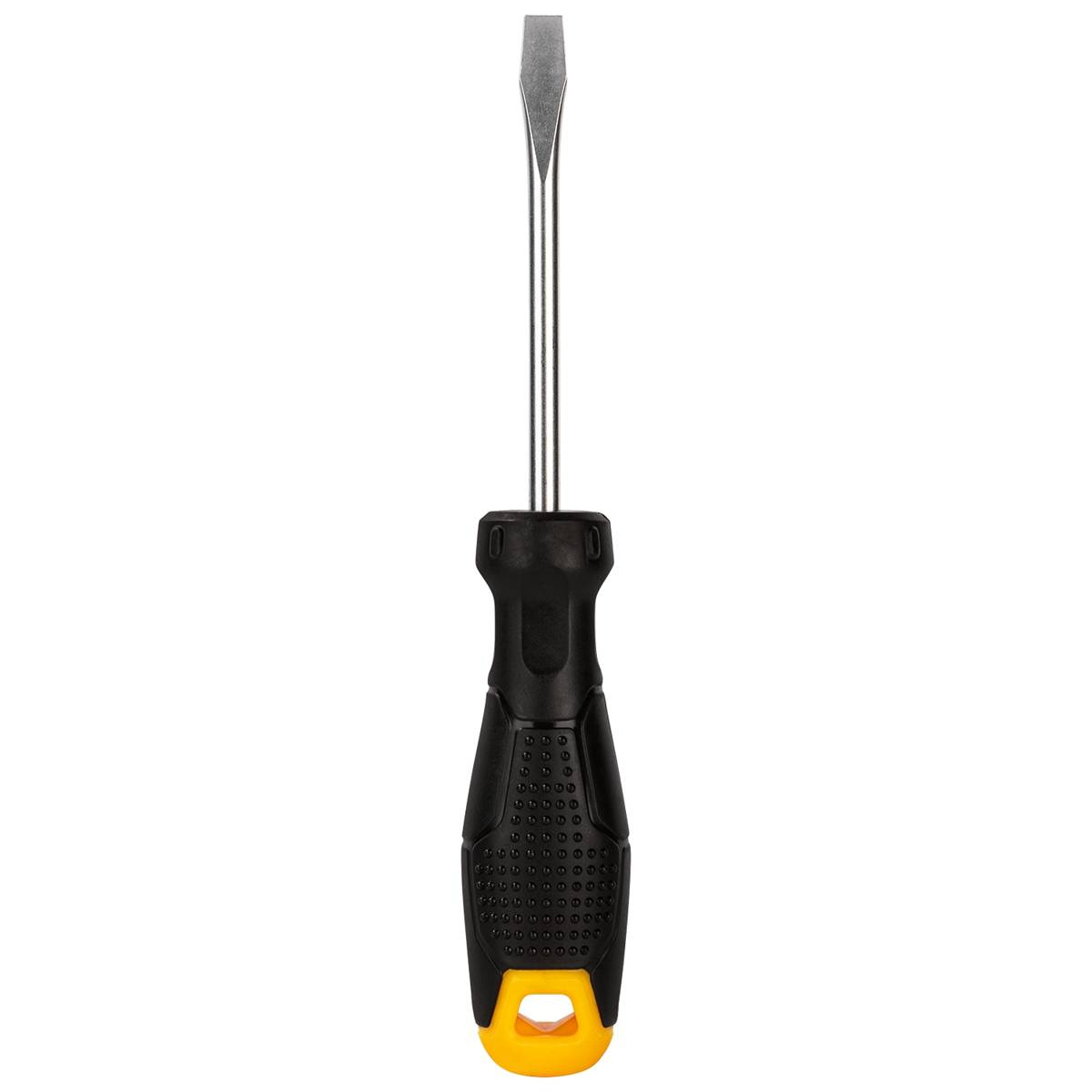 Tournevis plat noir pratique et durable avec poignée en plastique de haute qualité. Confortable à utiliser et facile à suspendre.
