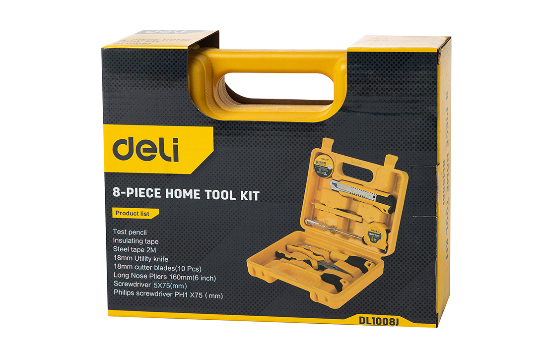 Le set Deli comprend 8 outils indispensables pour vos travaux quotidiens. Que ce soit pour assembler des meubles, des accessoires de cuisine ou des lampes, l’EDL1008J sera votre allié. Tous les éléments sont rangés dans un étui pratique, facilitant leur stockage. Le set inclut : un couteau avec longueur de lame ajustable, 10 lames de rechange, un ruban isolant de 3 m résistant à l’eau et au feu, et un mètre ruban de 2 m. Le paquet contient également : 2 tournevis avec prise antidérapante, des pinces en acier inoxydable, et un testeur de tension résistant à la corrosion pour prises de 100 à 500V.